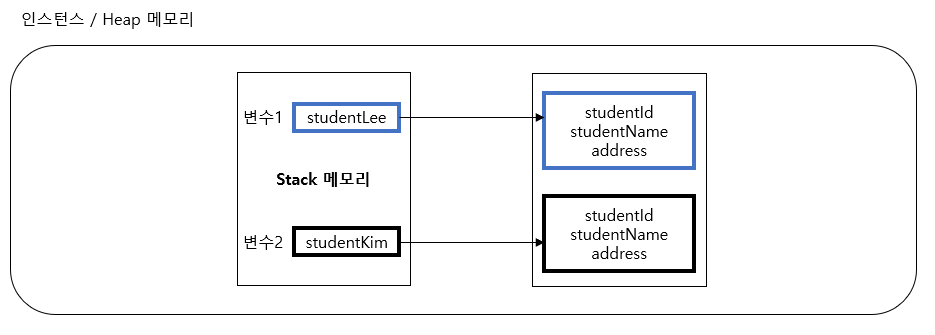 Stack 메모리에 생성된 변수는 Heap 메모리에 멤버변수들의 사이즈만큼 생성된 값의 위치를 가르킨다. new 키워드로 생성된 Heap 메모리의 멤버변수들은 인스턴스라고 정의한다. (메소드는 다른 곳에 호출 됨) 이 후 Stack 메모리에서 사라진 변수들의 인스턴스는 Garbage Collector가 일정 주기마다 수거하여 처리한다.