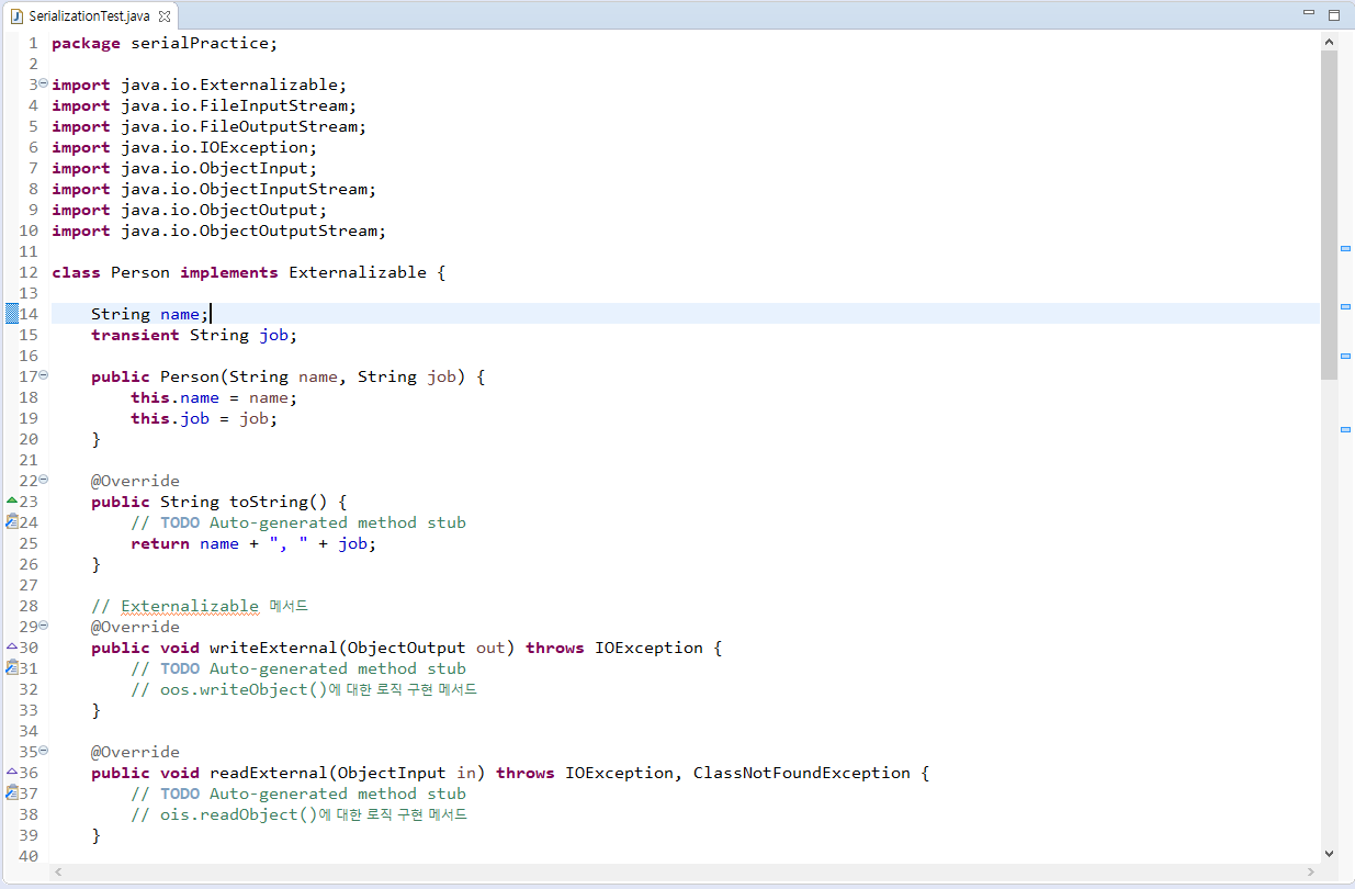 구현할 수 있는 메서드가 존재한다(writeExternal, readExternal). readObject, writeObject에 대한 직접 읽고 쓰는 로직 구현이 가능하다.