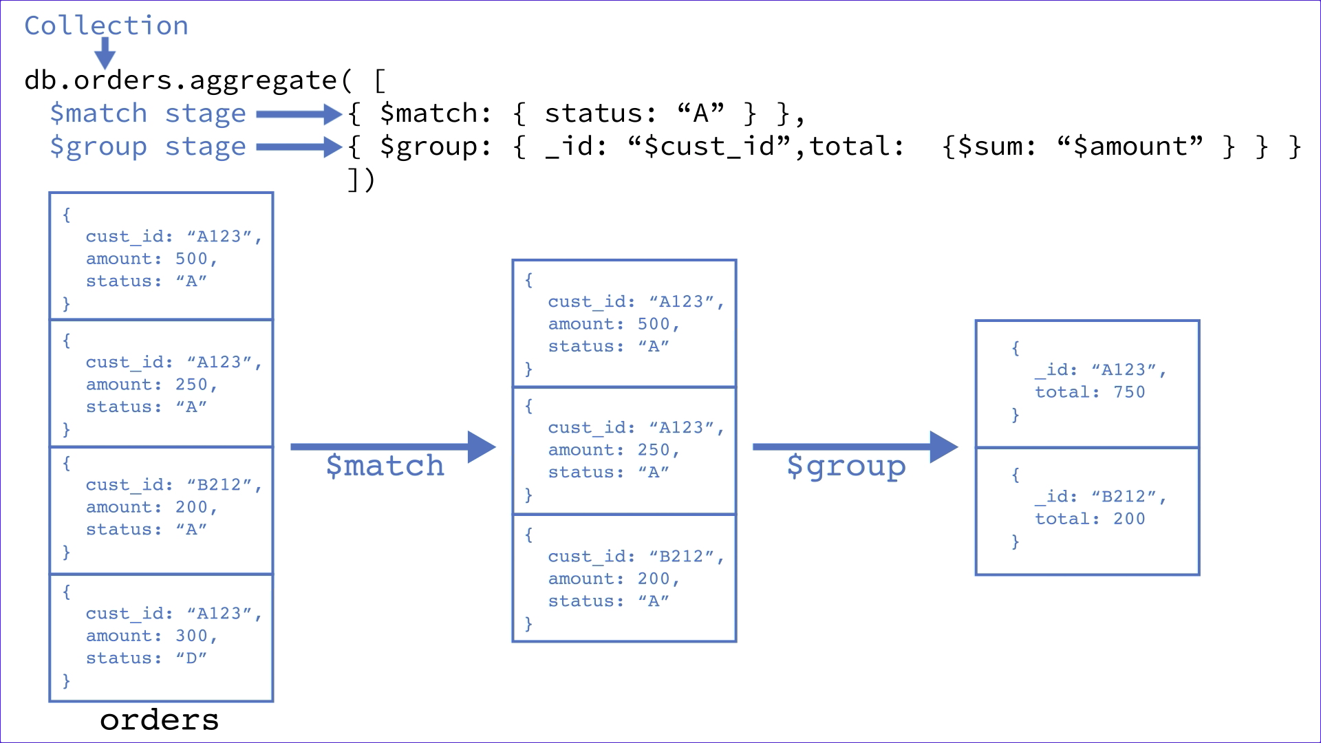 aggregate() 메서드는 파이프라인 단계를 배열의 형태로 나타낸다. Document는 파이프라인 배열의 순서대로 가공되며, $out 및 $geoNear를 제외한 모든 단계는 파이프라인에 여러번 나타날 수 있다.