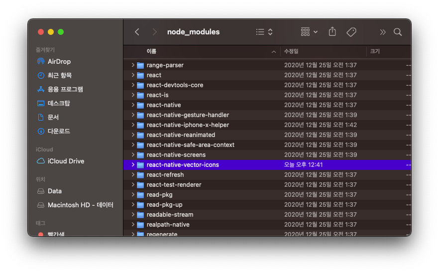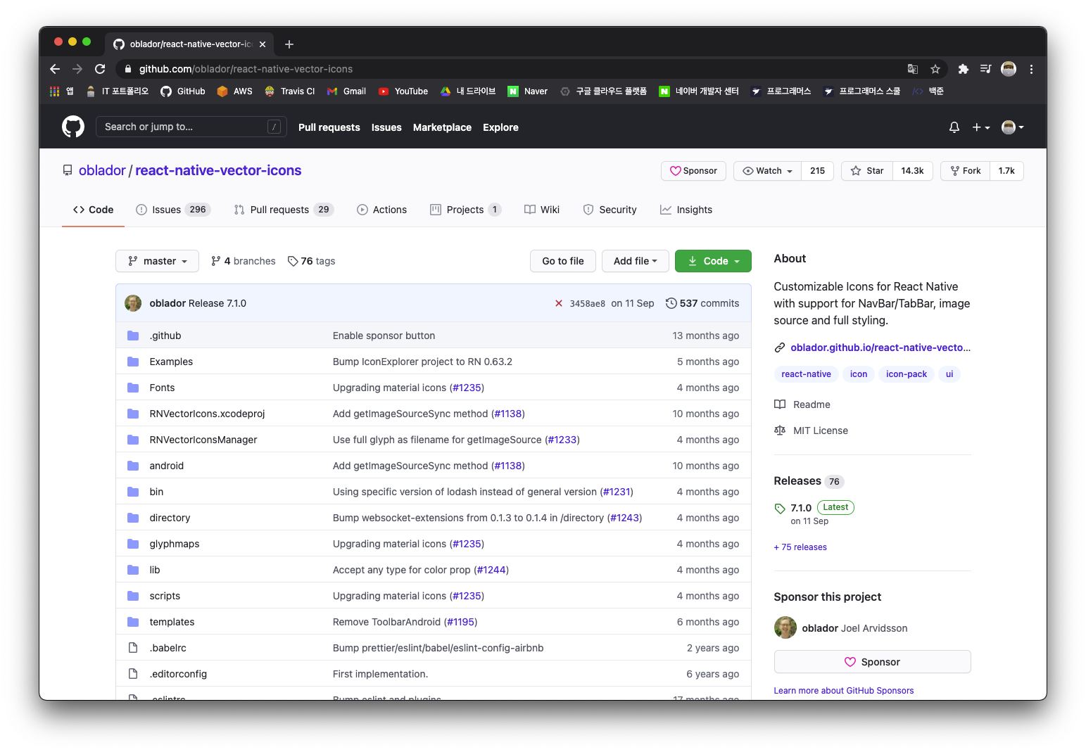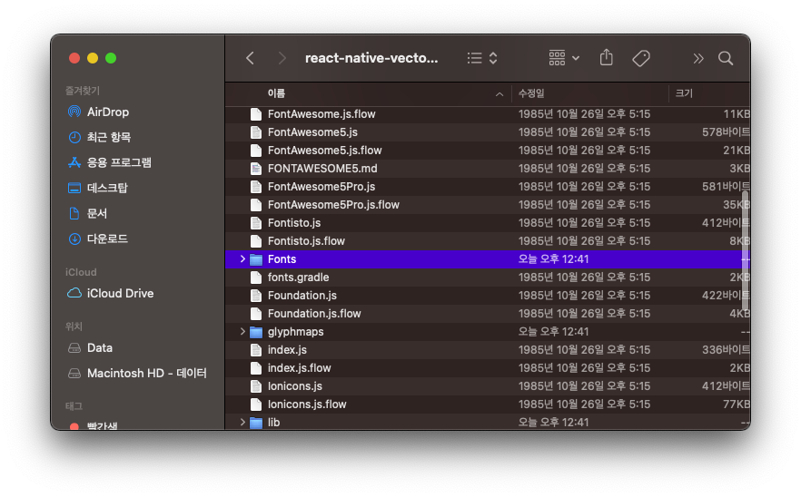 깃 허브(github.com/oblador/react-native-vector-icons)의 메뉴얼에 따라 설치를 진행한다.