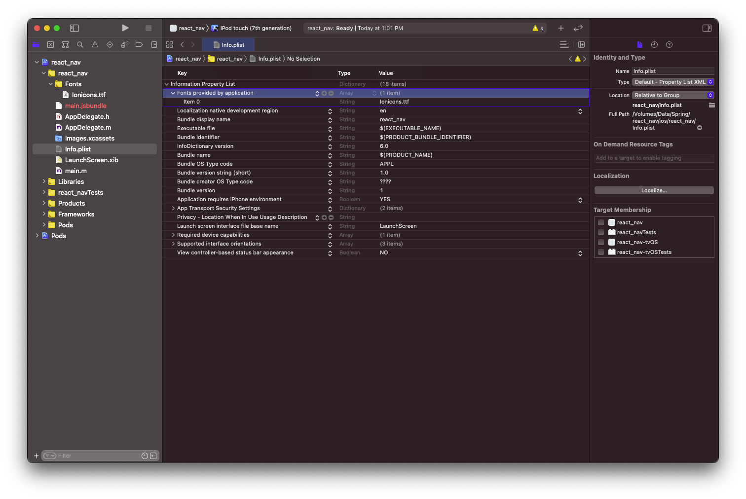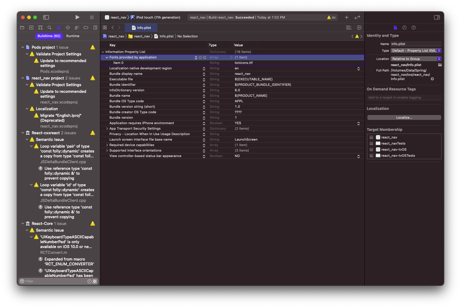 - xcode의 Fonts 그룹에 ttf 파일(프로젝트 - node_modules- react-native-vector-icons - Fonts 하위에 존재)을 이동 (2)