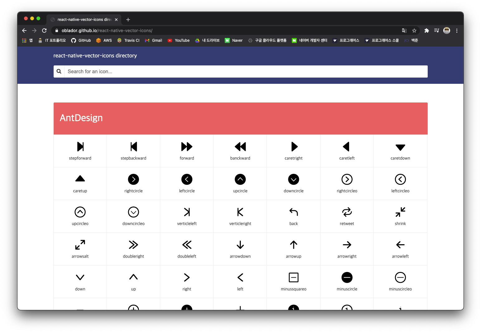 Ionicons에서 사용 가능한 아이콘은 Bundled Icon Sets의 Browse all(oblador.github.io/react-native-vector-icons/)을 통해 확인할 수 있다.